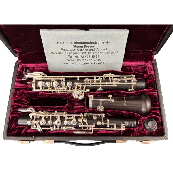 Hier bieten wir eine A. Durin Oboe (halbautomatisch) aus Grenadillholz an. Diese Instrumente wurden im Hause Bulgheroni gefertigt und eignet sich besonders gut als Schul- und Studenteninstrument. Durch die hochwertige Verarbeitung und die zuverlässige Mechanik bietet die Oboe eine angenehme Ansprache und ein ausgewogenes Klangbild.