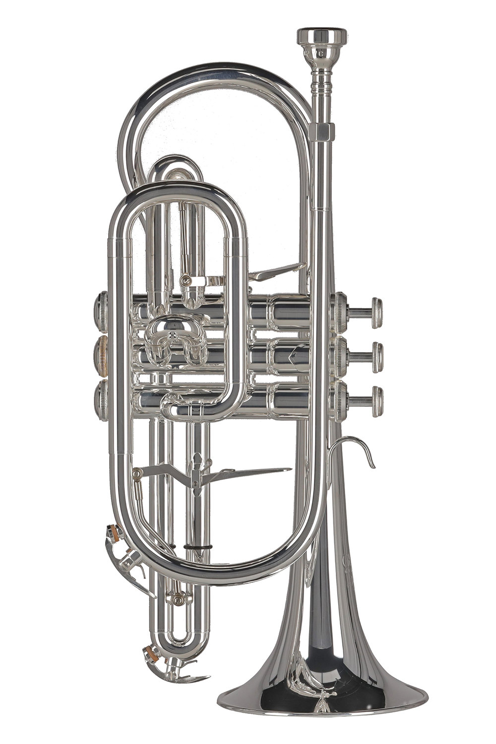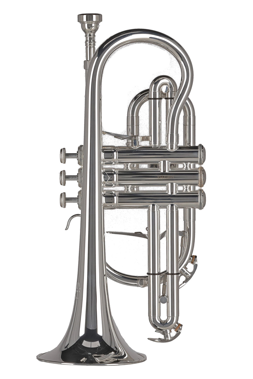 Kurzes Modell;Bohrung .450′ = 11.55mm;Messing Schallstück Ø 4 3/4“ = 119mm;Goldmessing Mundrohr;Neusilber Außenzüge;Edelstahl Ventile;Trigger am 1. und 3. Ventilzug;2 Wasserklappen;GEWA Mundstück 7C;Leichtetui mit Rucksackgarnitur;Versilbert;
