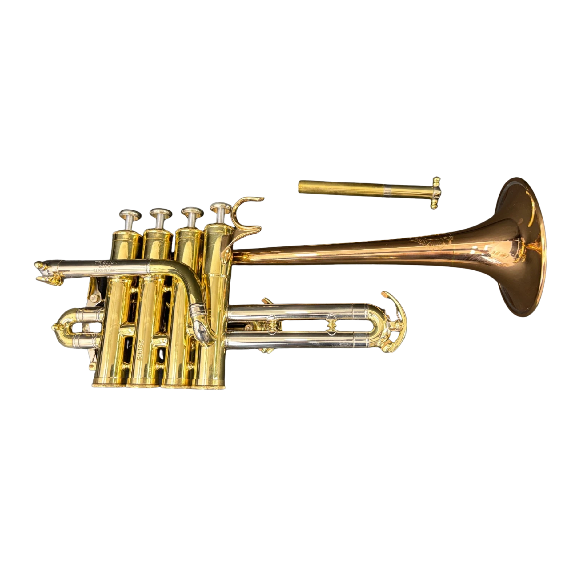 Neuwertige Cerveny Piccolo Trompete RSG mit 4 Périnetventilen. Goldmessing-Schallstück, zwei Mundrohre für A und Bb.