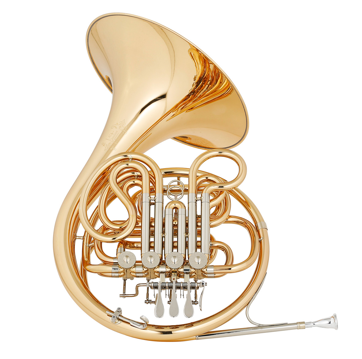 Goldmessing lackiert, 4 Zylinderdrehventile, Umschaltventil B/F und F/B, Bohrung 11,8 mm, Kugelgelenke, Goldmessing-Mundrohr, Neusilberventilbüchsen, Schallbecher Durchmesser 310 mm, verstellbarer Daumenhaken, Spiralfederdruckwerk, Neusilber-Außen- und Innenzüge. Inklusive Koffer & Mundstück.