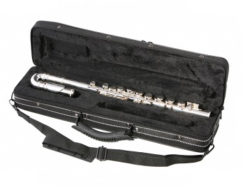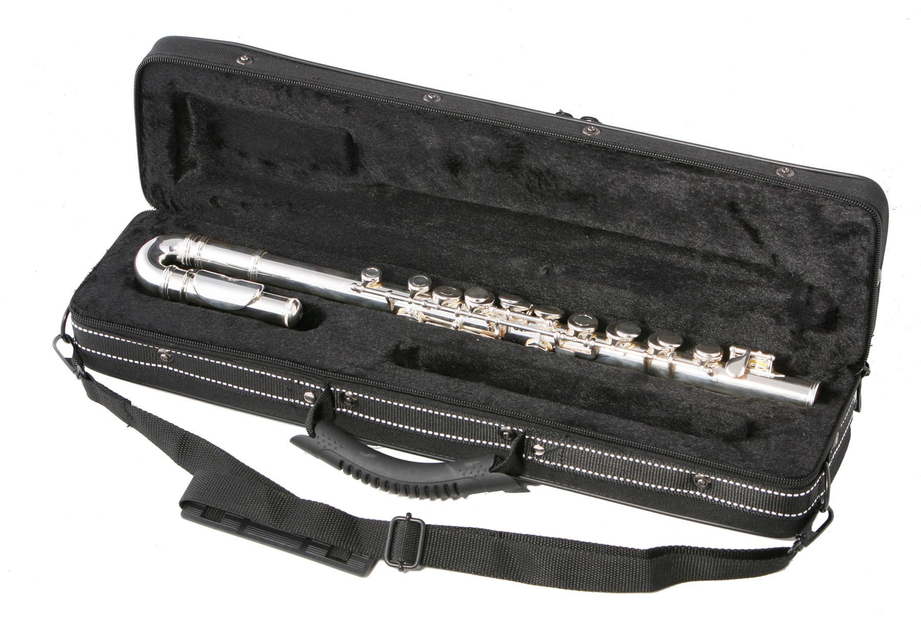 gebogenes Kopfstück, vereinfachte Mechanik (keine Triller) mit E-Mech., kindgerechte kürzere Bauform ohne separates C-Fußstück, tiefster Ton D, Neusilber versilbert, Etui