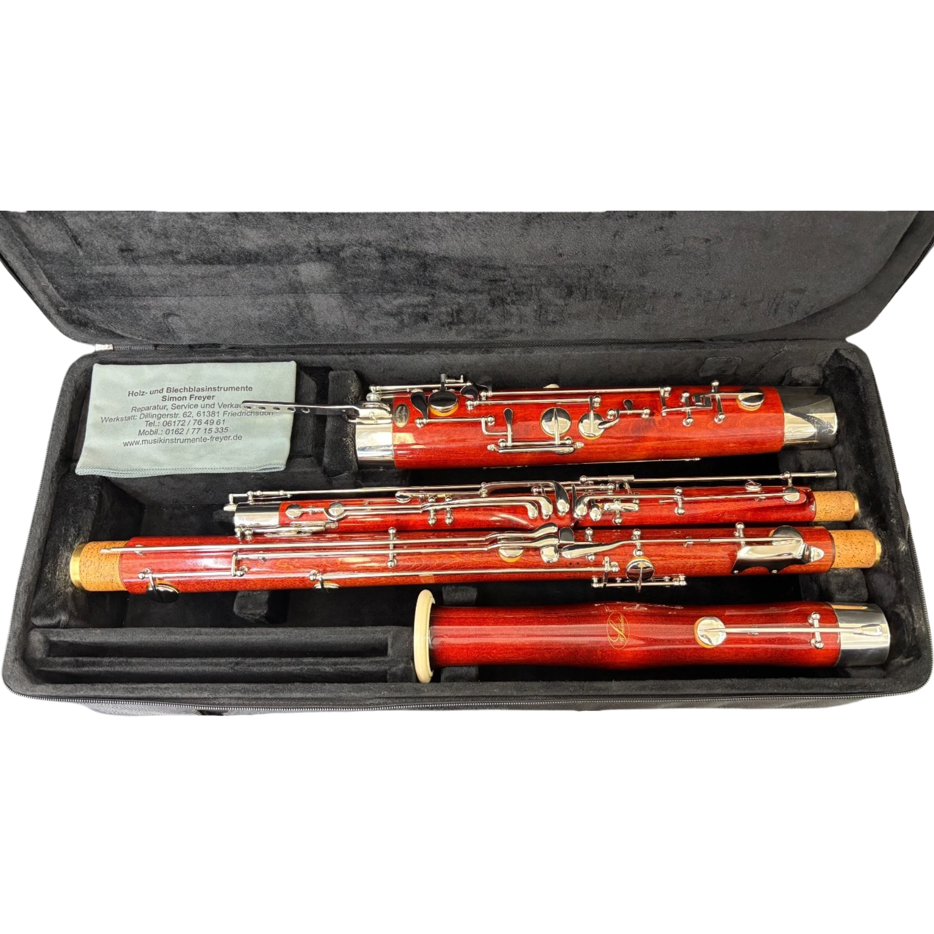Es handelt sich um ein handgefertigtes Schreiber Fagott Modell 5016 S-16. Das Instrument wurde fachgerecht generalüberholt, wodurch sich Mechanik, Korke, Filze und Polster in einem einwandfreien Zustand befinden und das Fagott 100% spielbereit ist.